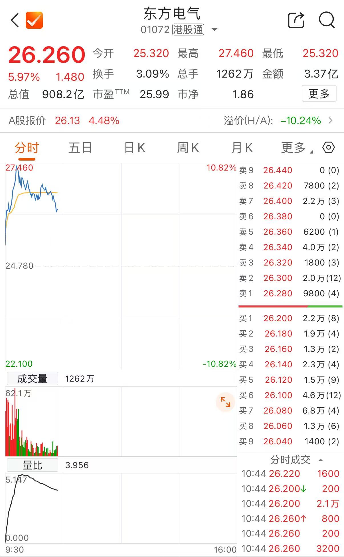 上证报中国证券网讯(记者 徐潇潇)1月16日,港股电力设备股表现活跃,东方电气H股一度涨超10%,截至10时45分,东方电气H股涨5.97%,报26.26港元/股。哈尔滨电气、上海电气H股、信义光能跟涨。